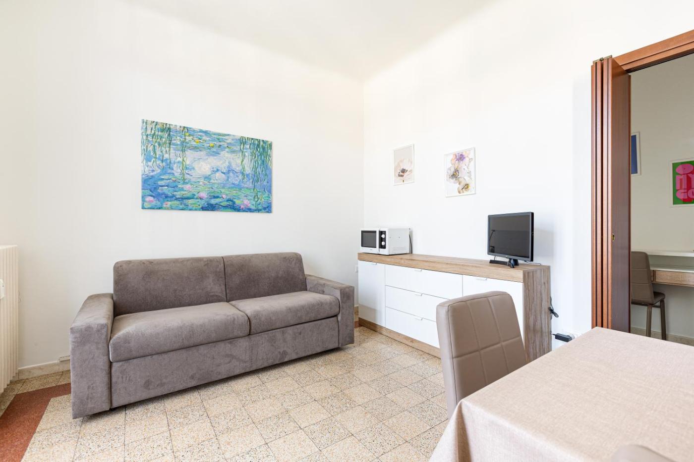 Appartamento con 1 Camera da Letto. This apartment is comprised of 1 living room, 1 separate bedroom and 1 bathroom with a shower and a bidet. Meals can be prepared in the well-fitted kitchen, which is fitted with a stovetop, a refrigerator, kitchenware and a microwave. A seating area with a TV, a washing machine and a balcony are featured in this apartment. The unit offers 3 beds.