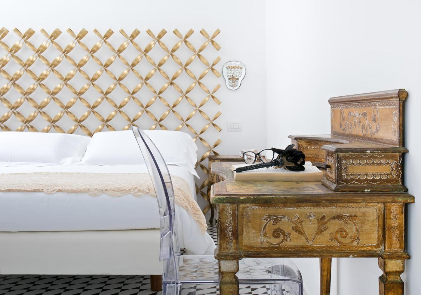 Junior Suite. Circondata dal giardino della struttura, questa suite dispone di un piccolo balcone e di un ingresso privato. Ă dotata di un letto in ferro battuto, di mobili del XVIII secolo e di tende dorate. ;